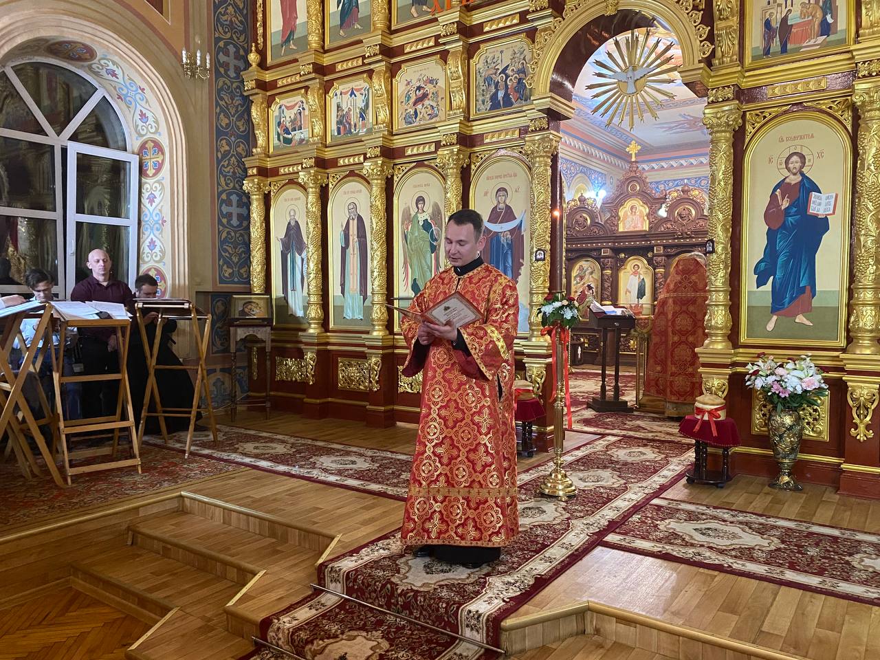 Богослужения совершил благочинный домового храма в честь трех вселенских учителей и святителей Василия Великого, Григория Богослова и Иоанна Златоуста – проректор по учебной работе иерей Алексий Колыванов в сослужении студентов выпускного курса бакалавриата иерей Михаил Попович и студент пропедевтического курса магистратуры диакон Виктор Довмат.