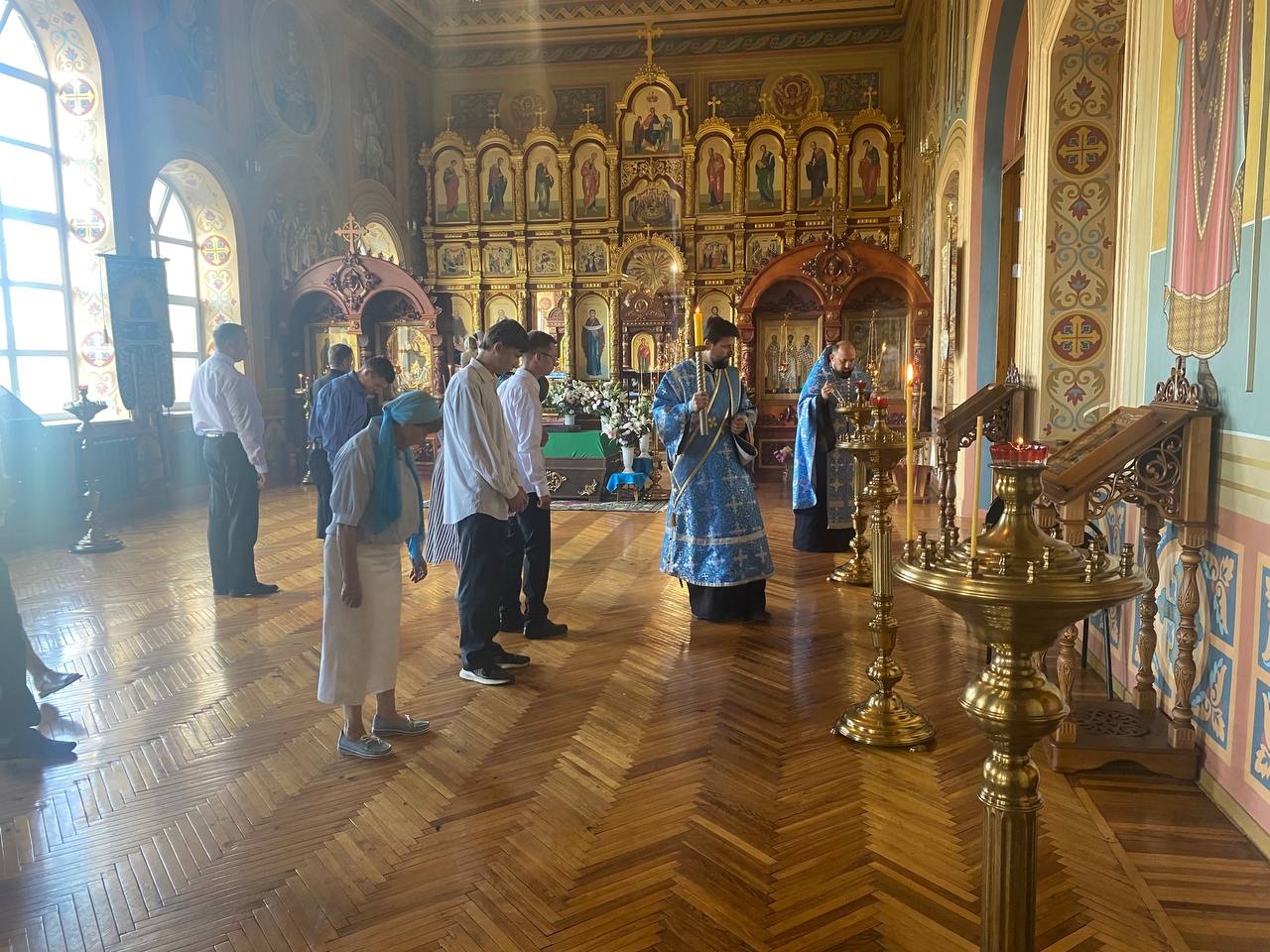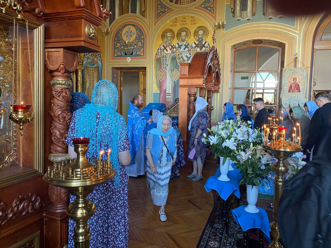 На великой утрене по «Бог Господь» из алтаря в центр храма была положена Плащаница Пресвятой Богородицы. На чтении канона Праздника прихожане прикладывались ко святому образу, отец Петр совершал помазание освященным на литии елеем.
