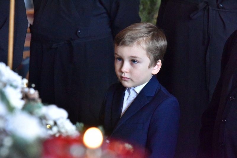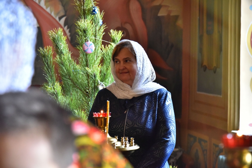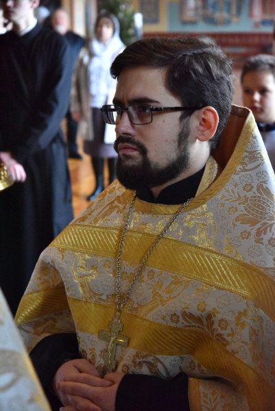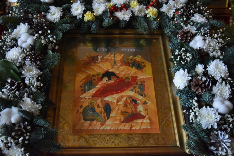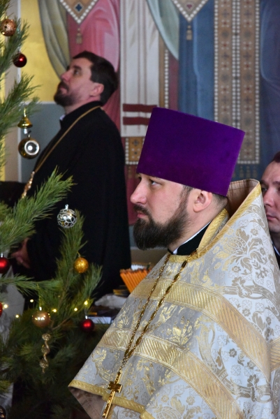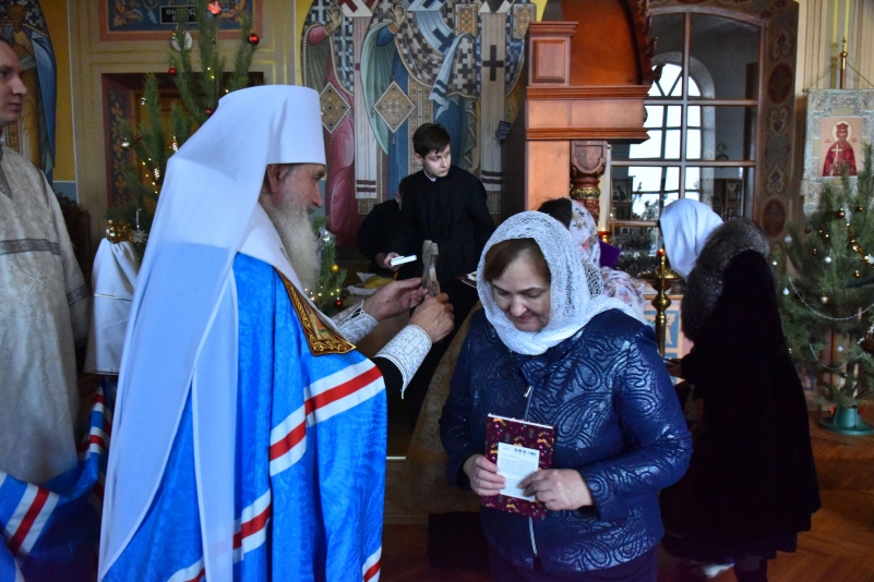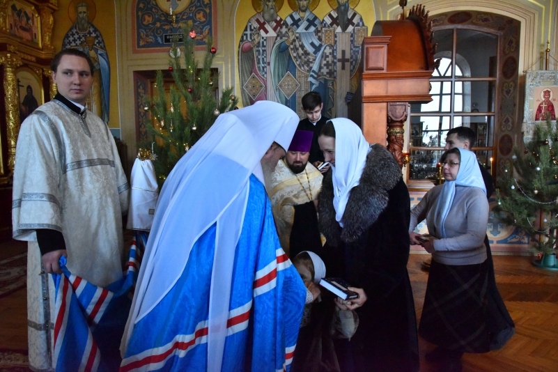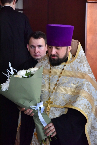 После возглашения Многолетия отец Петр поздравили архипастырь с великим торжеством Христова Рождества и преподнес букет белых цветов.