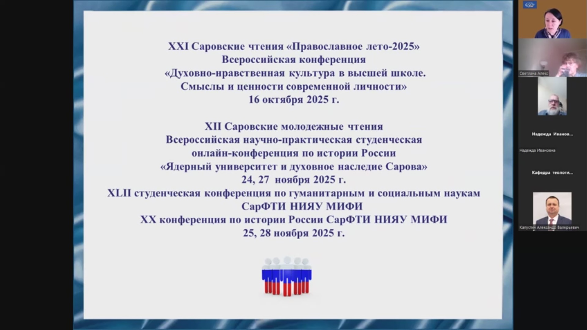 21 апреля 2025 г. Лариса Евгеньевна Ильина, к.пед.н., доцент кафедры филологических дисциплин семинарии и Даниил Ордийчук, студент 2 курс бакалавриата приняли участие в ХI Саровских молодежных чтениях — Всероссийской научно-практической студенческой онлайн-конференции по истории России «Ядерный университет и духовное наследие Сарова: к 80-летию Великой Победы».