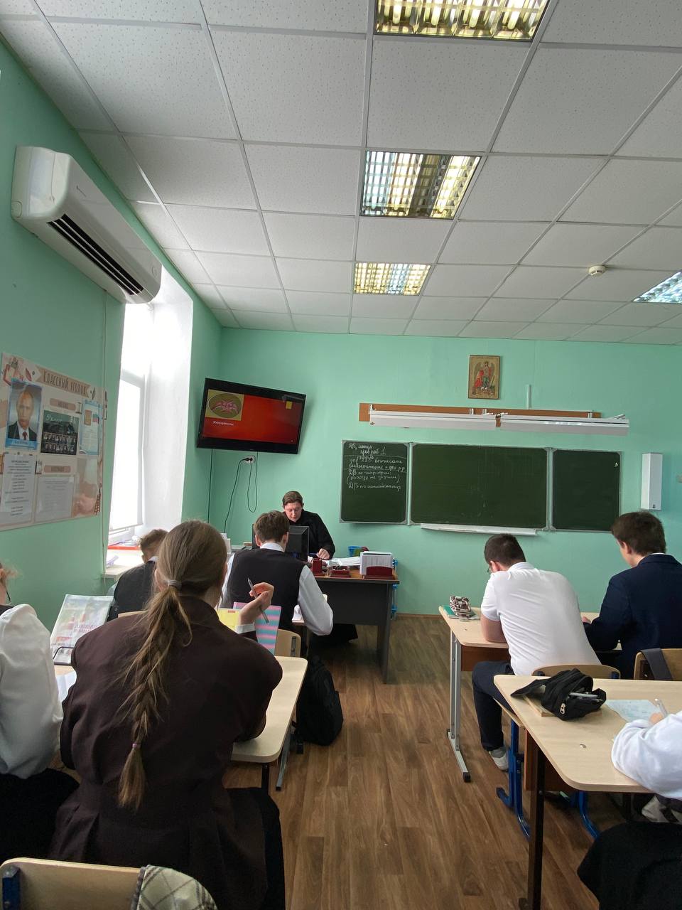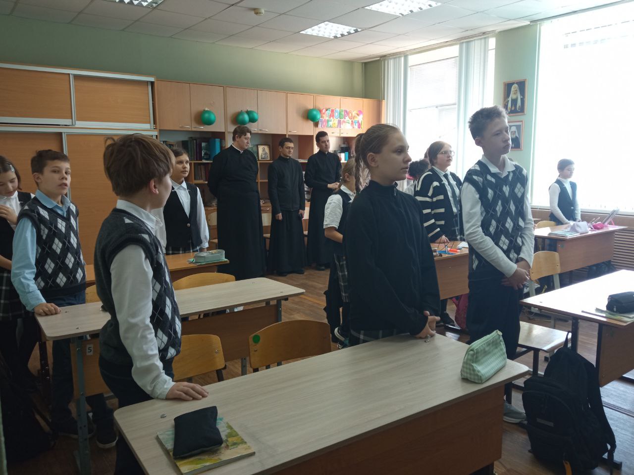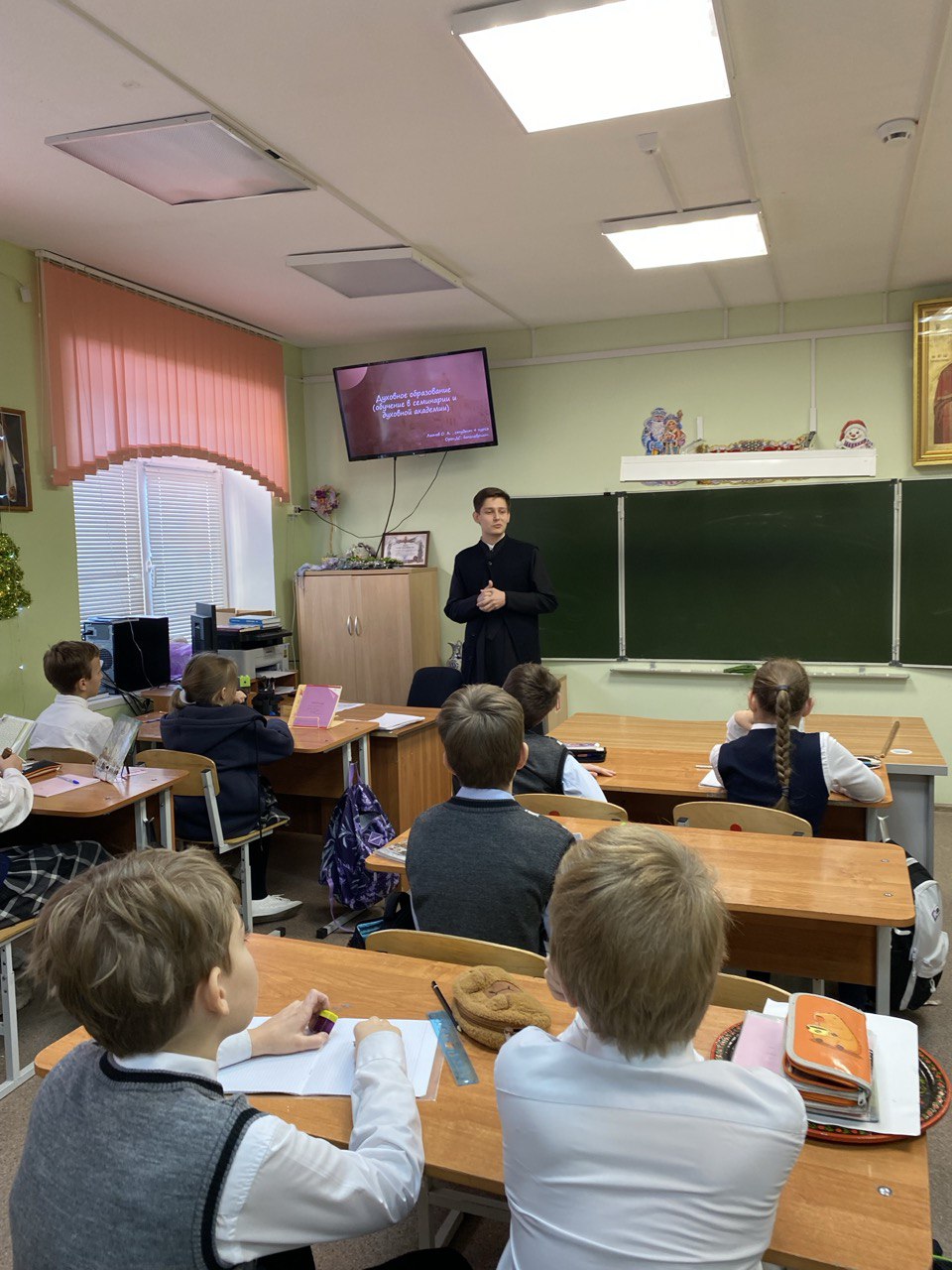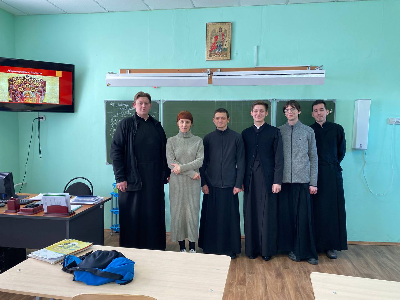 Рафаил Кадиков провел урок в 7 классе на тему «Русская Церковь при Иоанне Грозном», Анатолий Ковалев провел урок в 8 классе на тему «Иконография ангелов», Олег Леонов и Михаил Егармин провели уроки в двух 5 классах на тему «Духовное образование (обучение в семинарии)», Антоний Борков – в 8 классе на тему «Первый Вселенский собор». Даниилу Волкову предстоит провести урок 18 декабря в 8 классе на тему «Иконография ангелов». В классах царила атмосфера искреннего интереса: гимназисты с вниманием слушали будущих наставников, активно участвовали в беседах, задавали вопросы.
