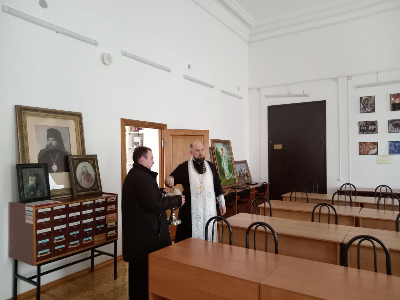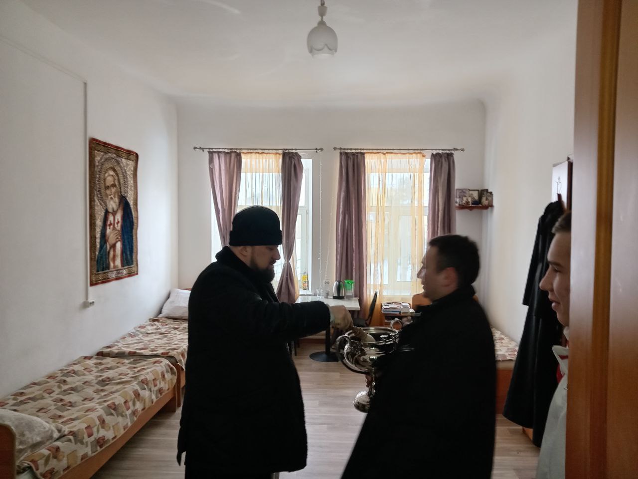 По доброй традиции в этот день отец Петр окропил святой водой кабинеты учебного корпуса, студенческого общежития и хозяйственных помещений. Окропление жилищ в крещенские дни — важная церковная традиция, через которую призывается Божие благословение на места повседневных трудов и отдыха.