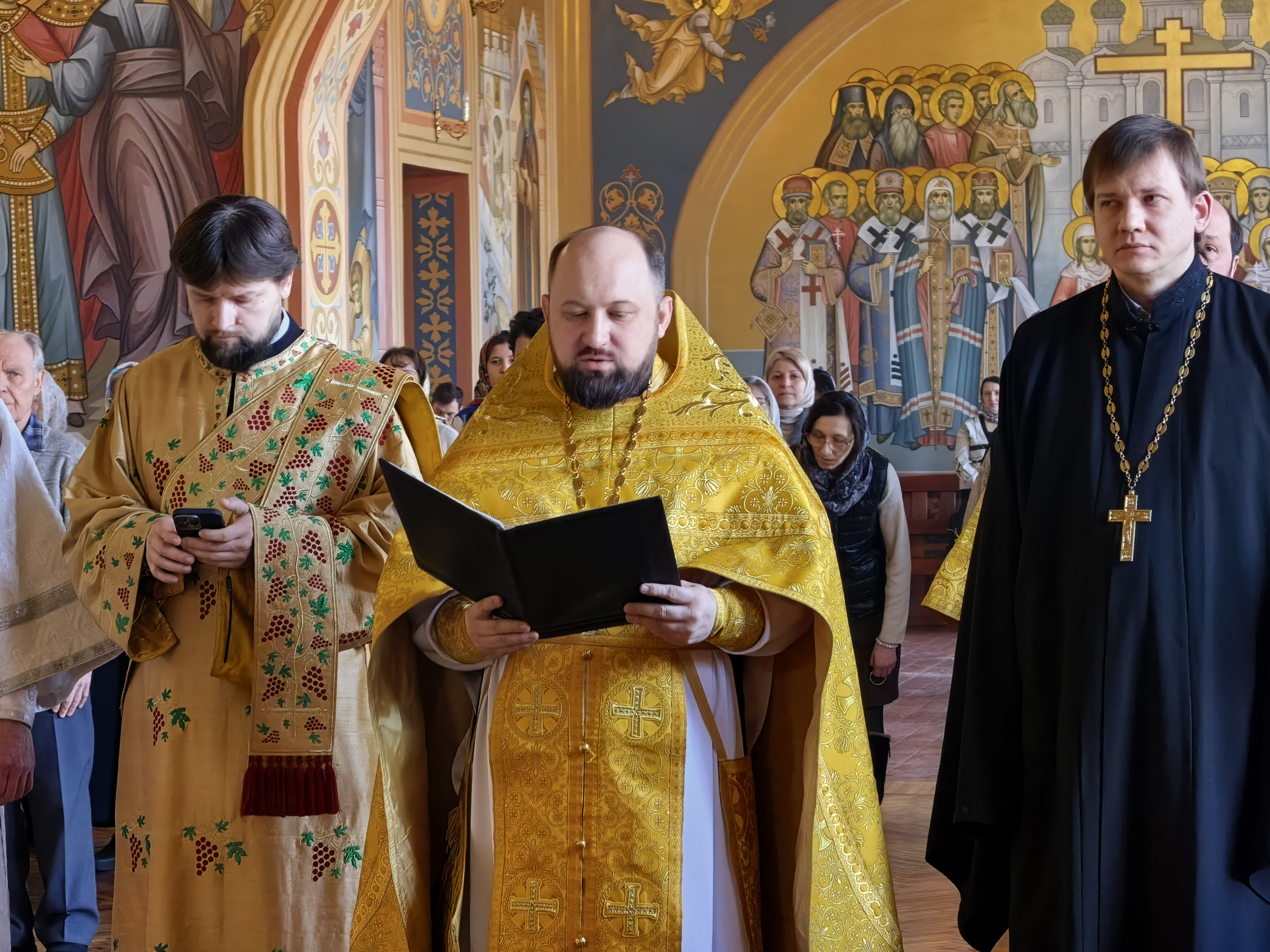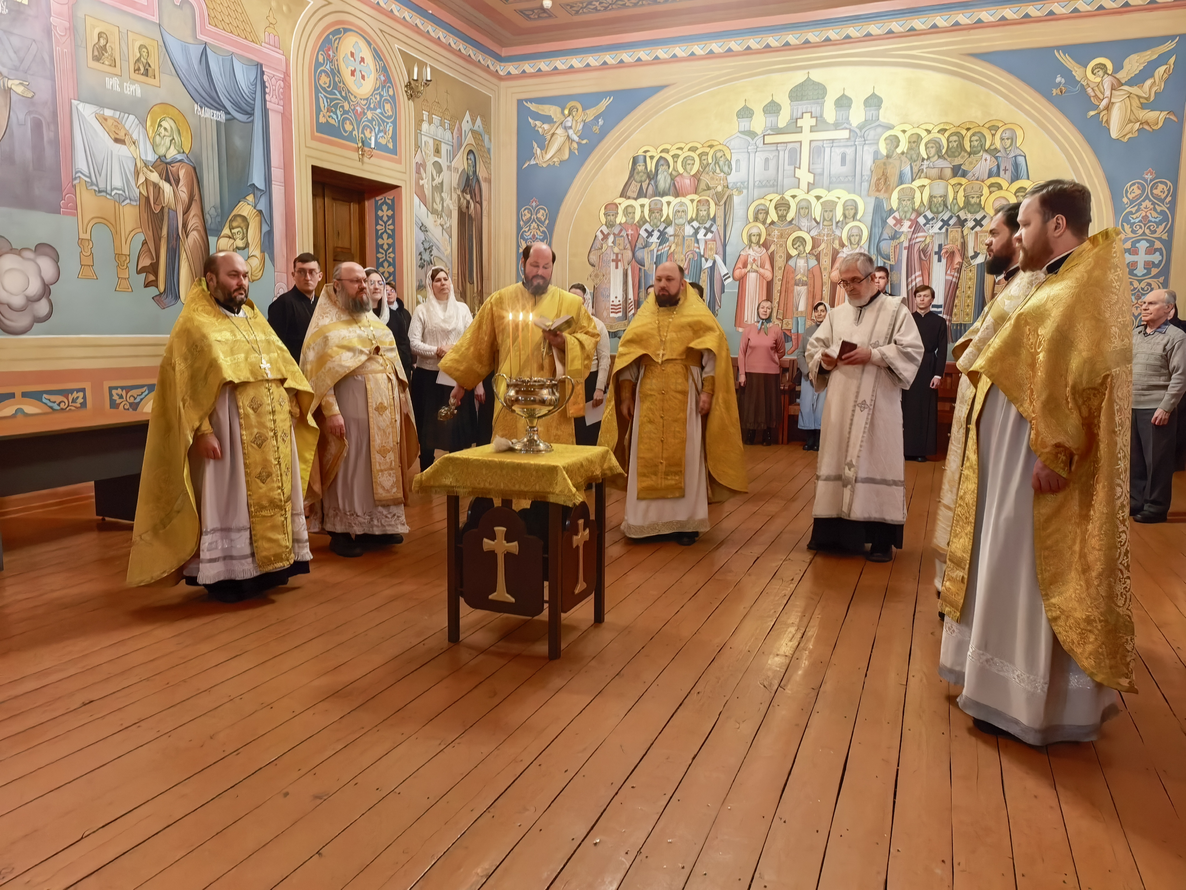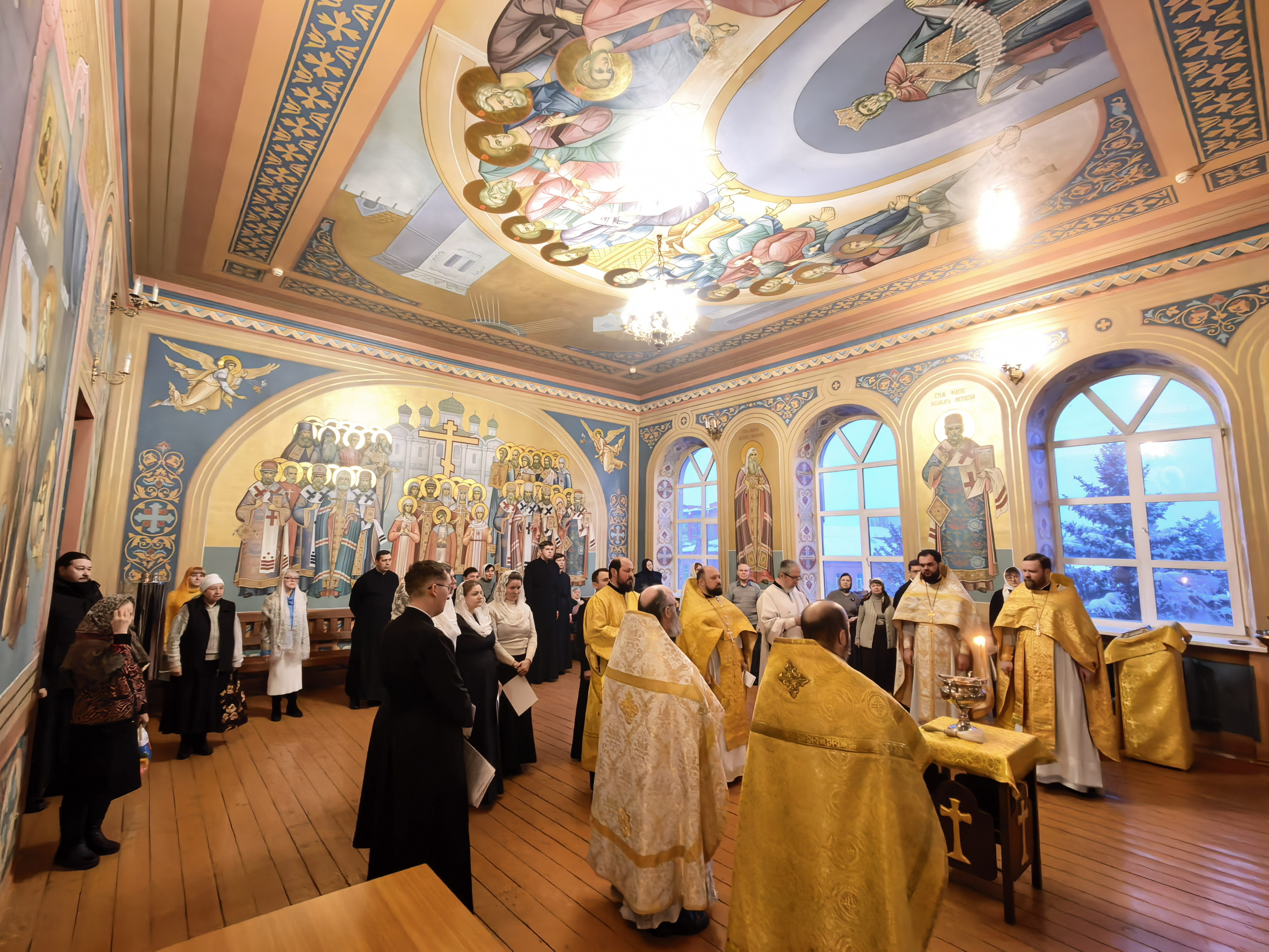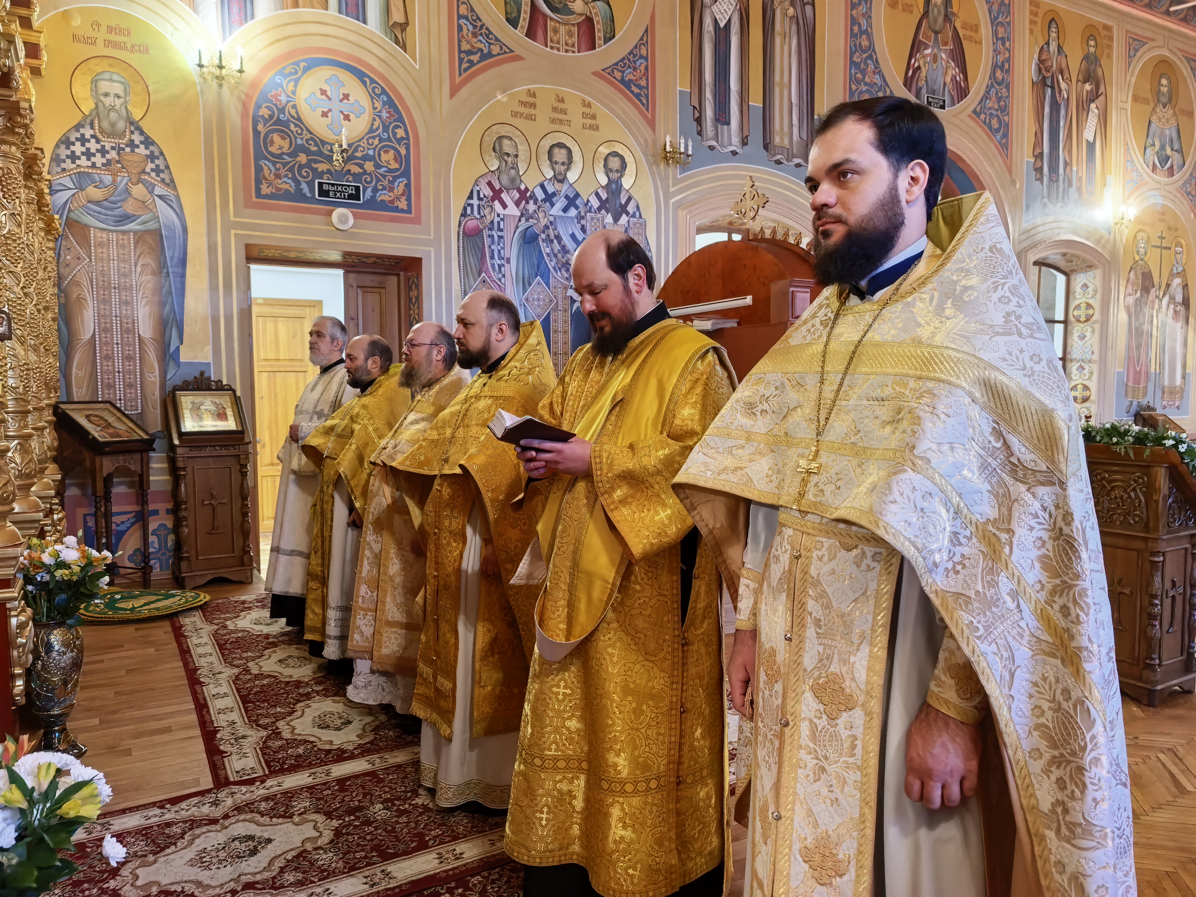 По заамвонной молитве духовенство совершило славление трем святителям, отец ректор прочитал молитву ко святым.