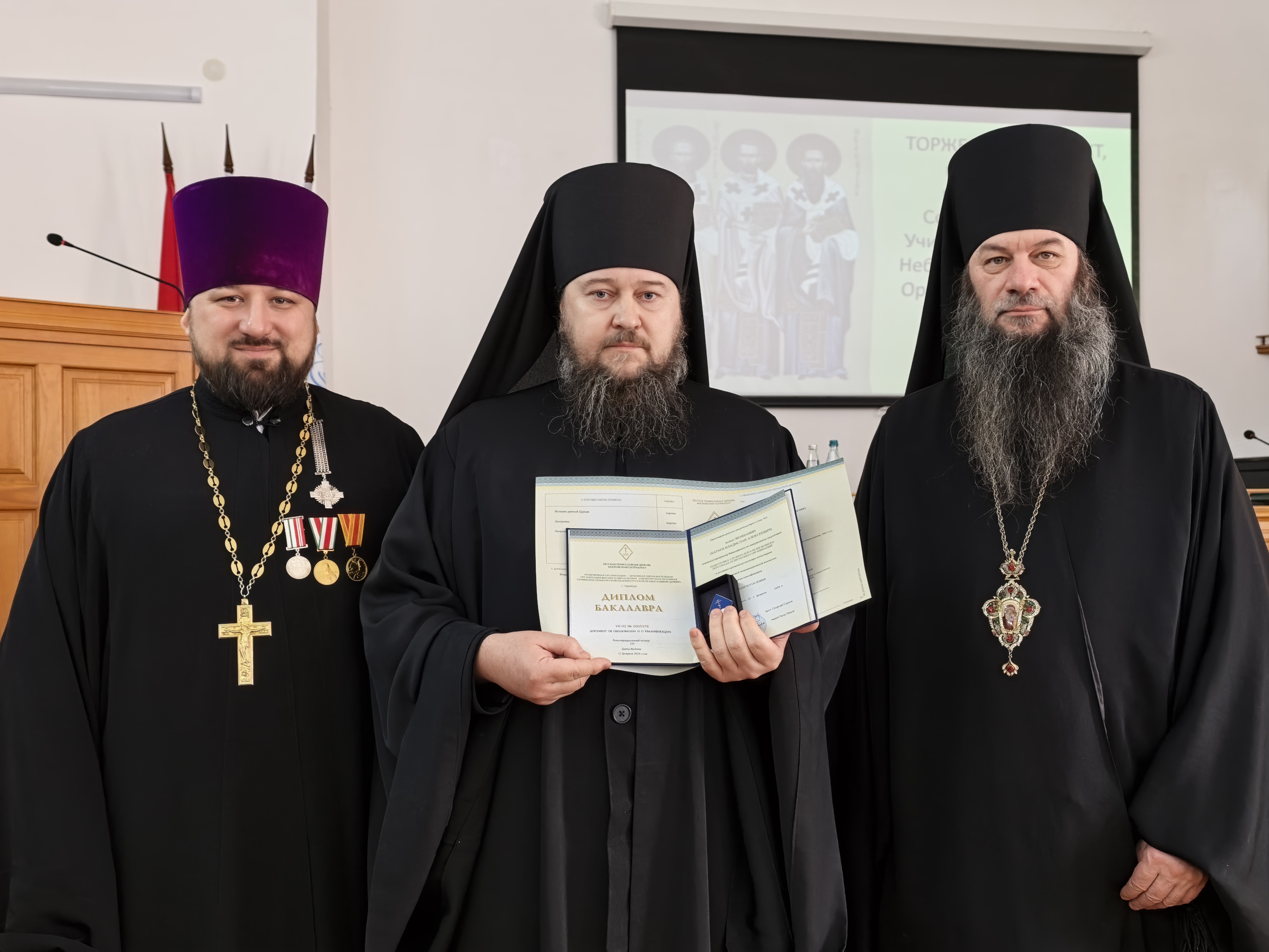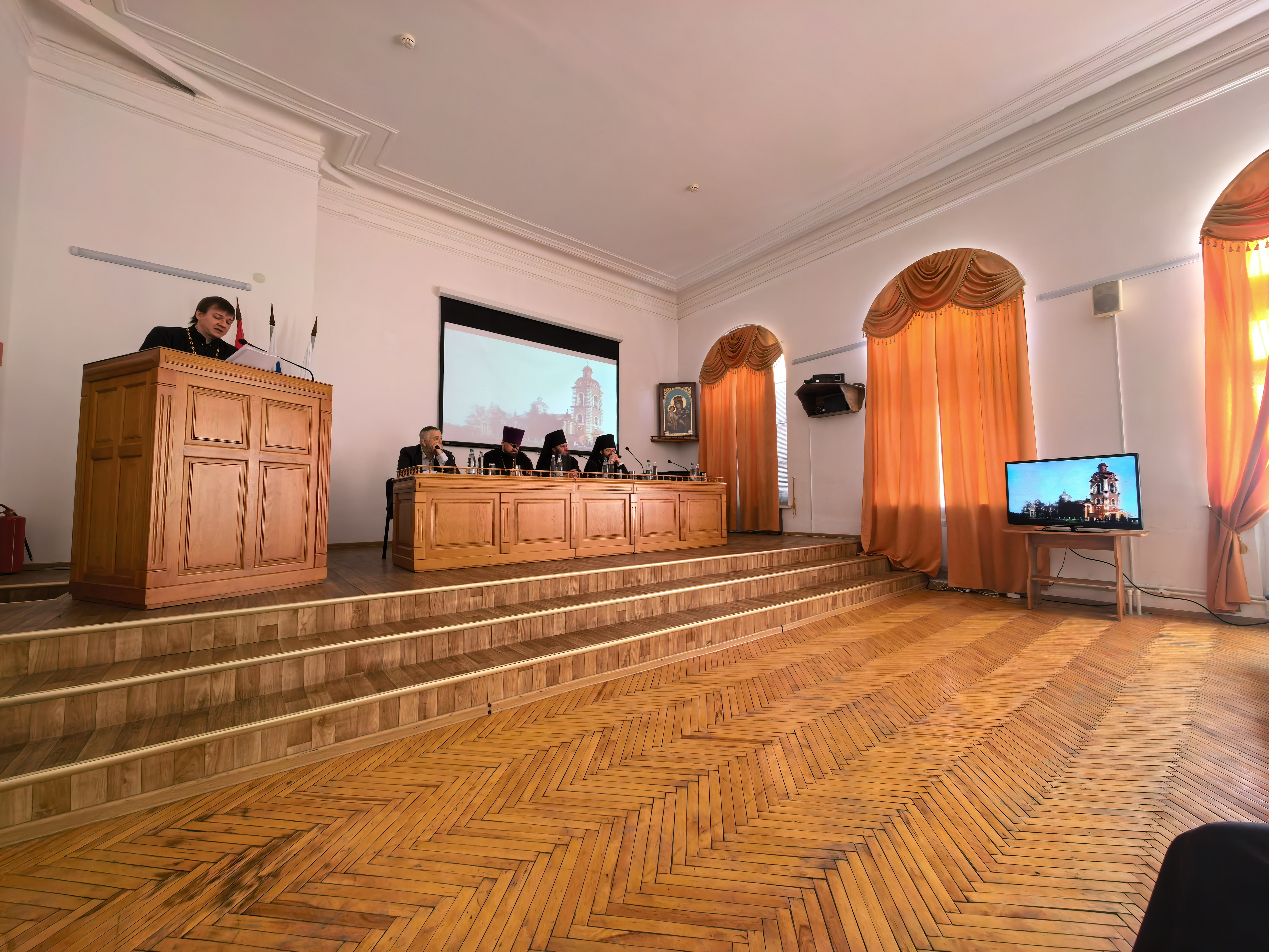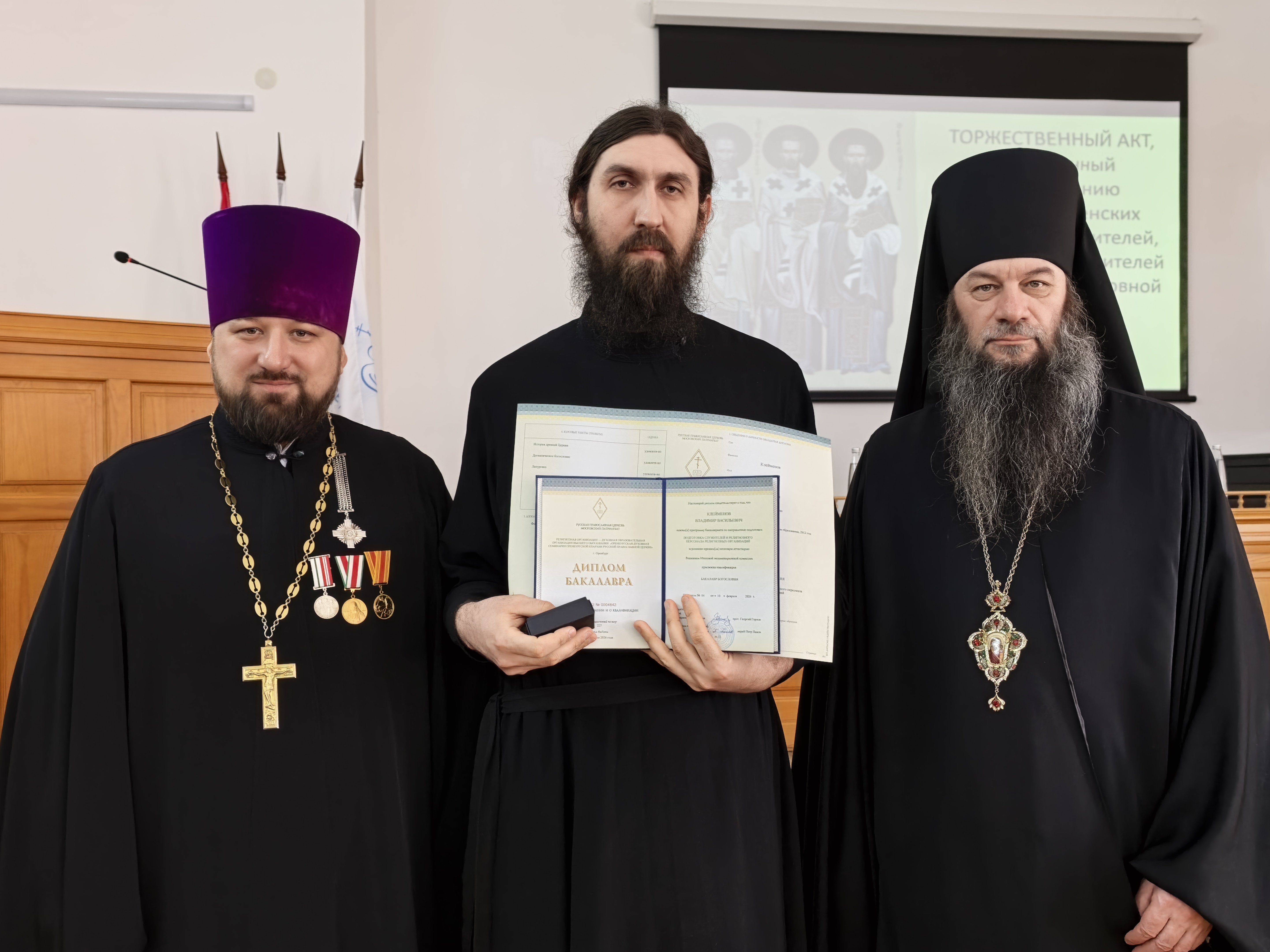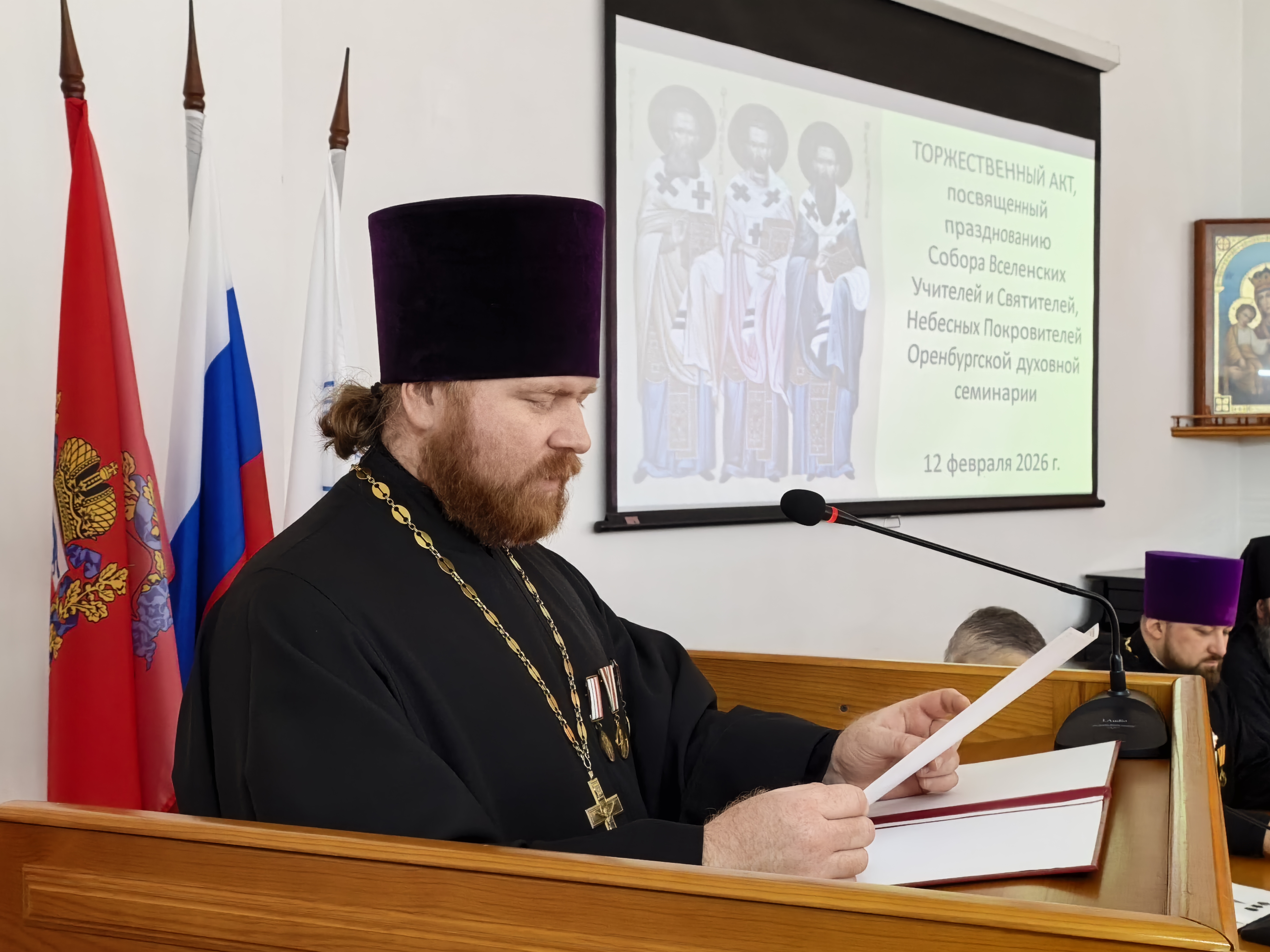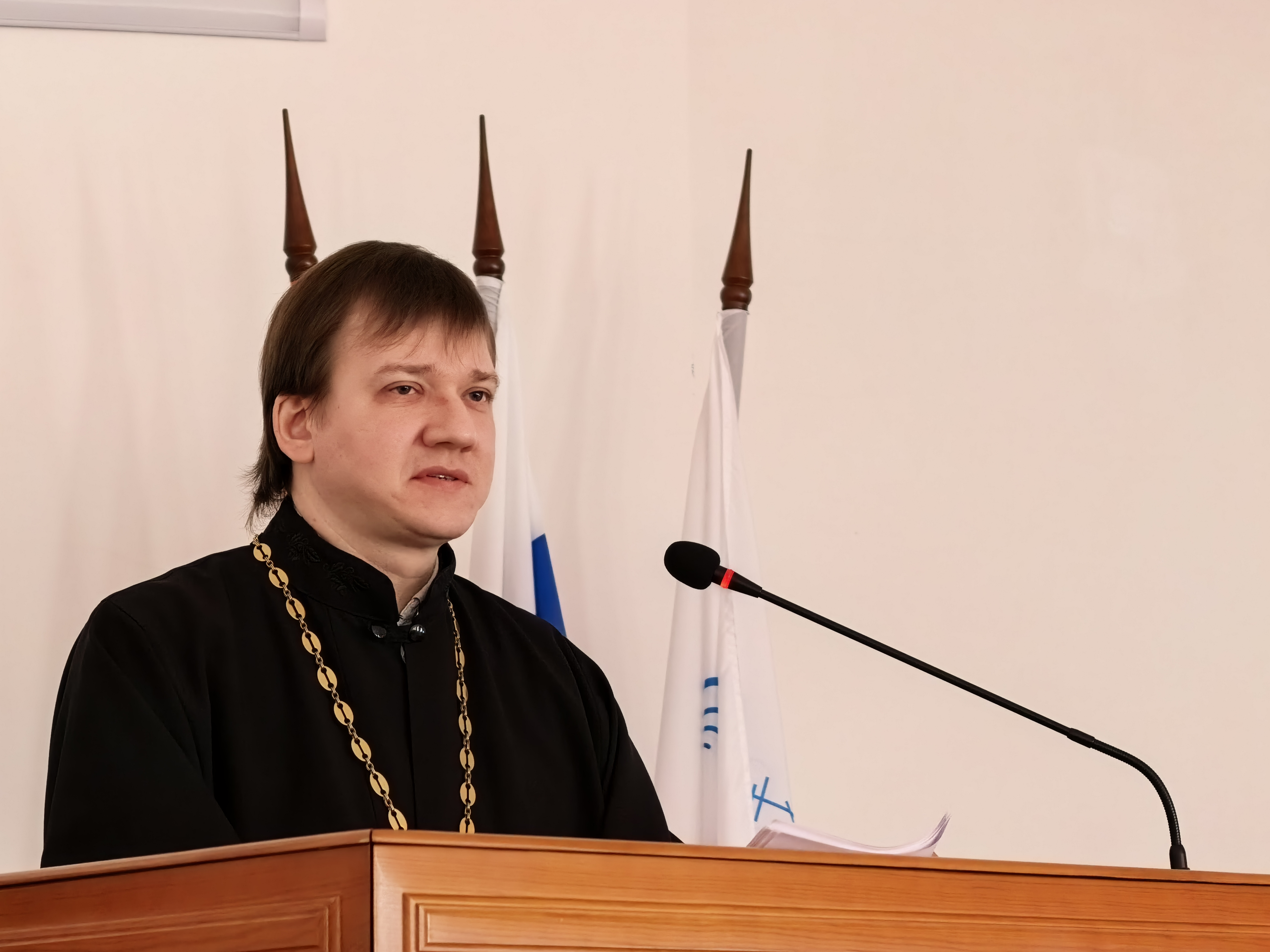 С академическим докладом «»Золотой собор» Оренбурга: от кафедры — к учебному храму, из руин — к возрождению (1746 — 2026)» выступил заведующий регенстским отделением иерей Александр Ромашков.