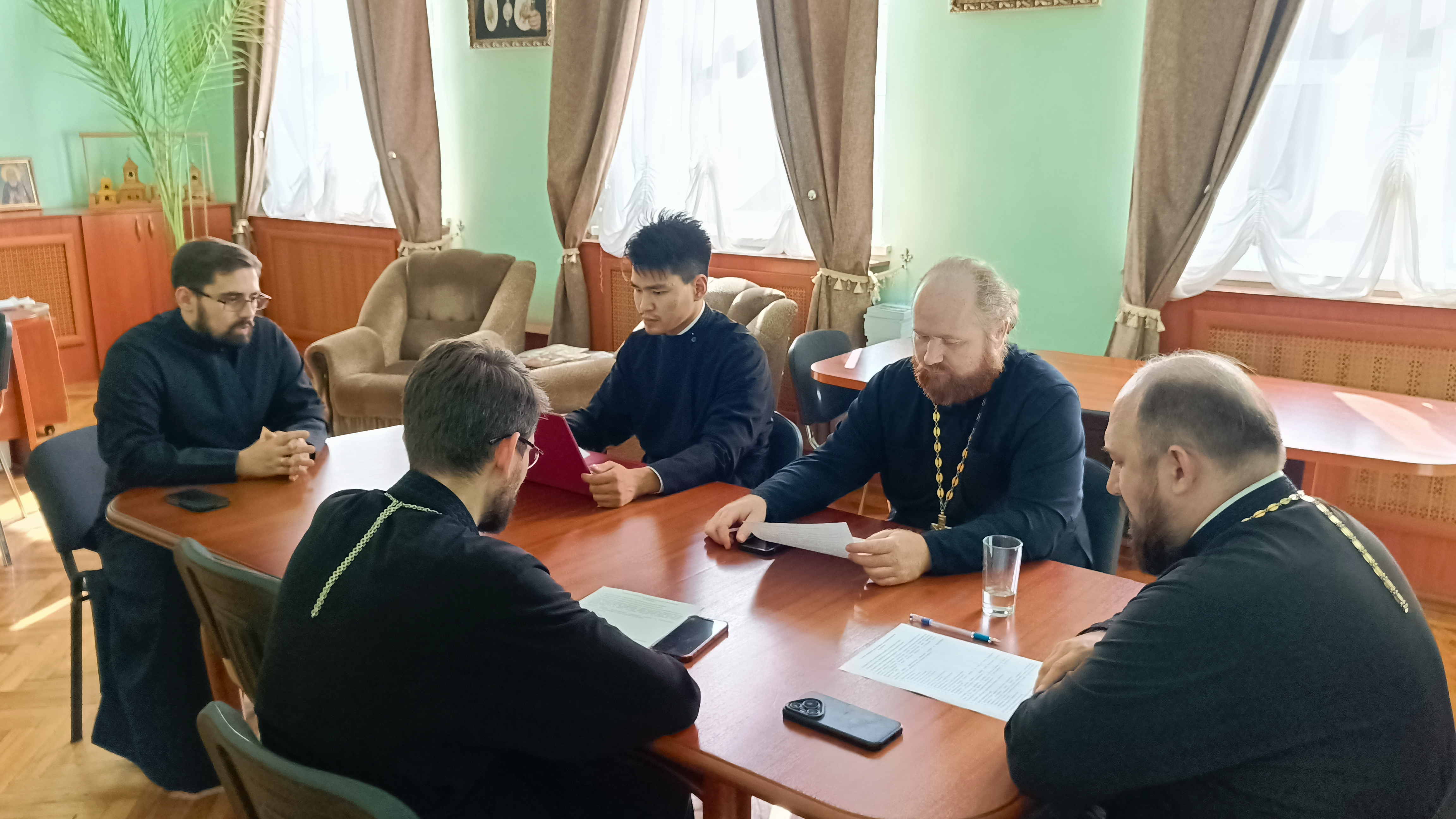 В заседании приняли участие: проректор по учебной работе иерей Алексий Колыванов, проректор по воспитательной работе Р.И. Матаюпов, заведующий отделением заочного обучения и дополнительного образования иерей Сергий Мячин.